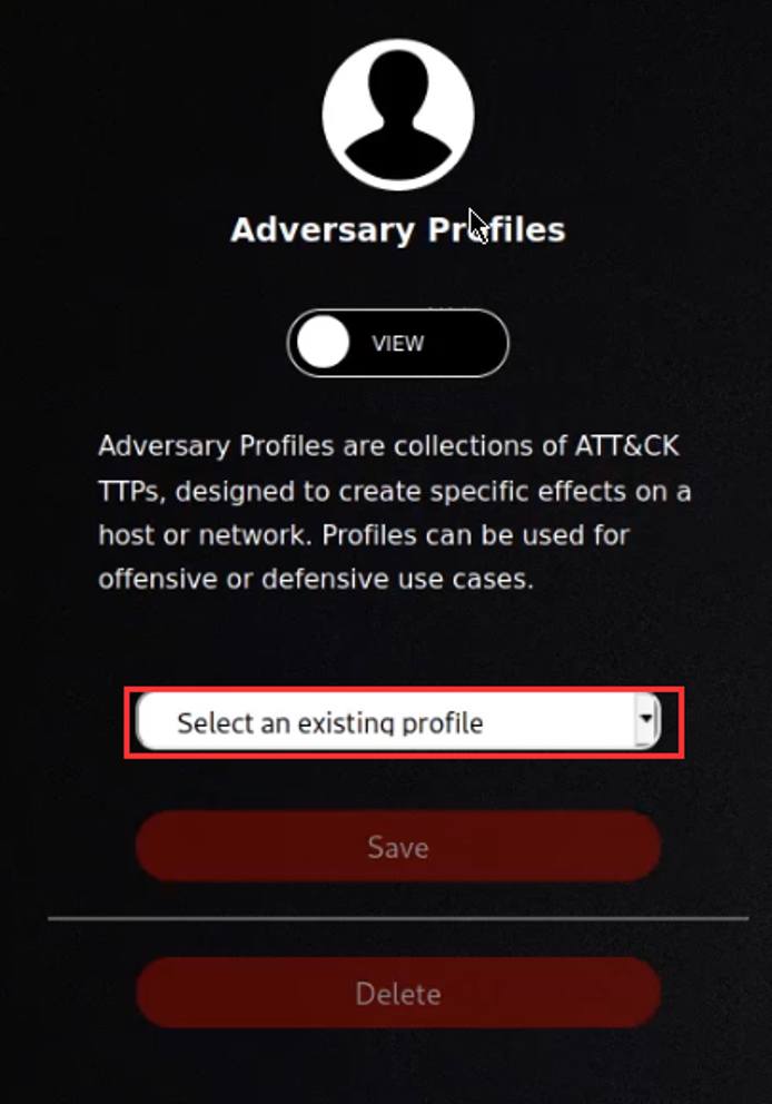 Adversary profiles can be accessed by navigating to the Adversary tab and clicking on the “Select an existing profile” drop-down menu as highlighted in the following screenshot.