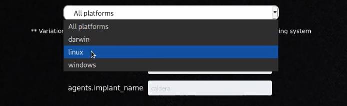 Choose an agent (Sandcat is a good one to start with) and a platform (operating system) as highlighted in the following screenshots.