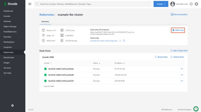 Navigate to the Kubernetes section of the Linode Cloud Manager and select the cluster you’d like to add a tag to.